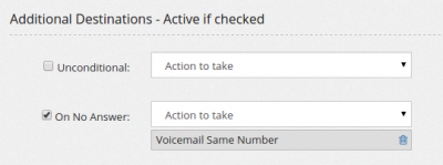 Inbound Dial Timeout sets the time in seconds one extension have to ring before going to the “No Answer” additional destination. You can avoid setting a Dial Timeout value and the default value will be used.