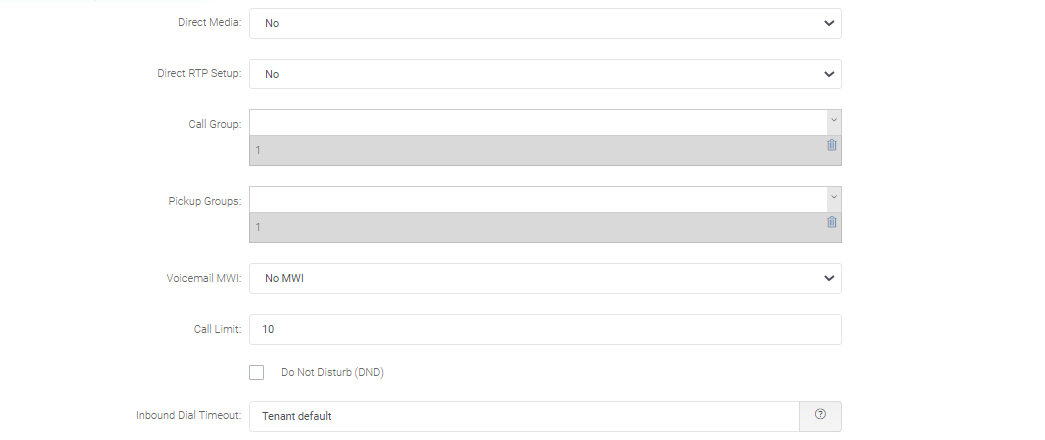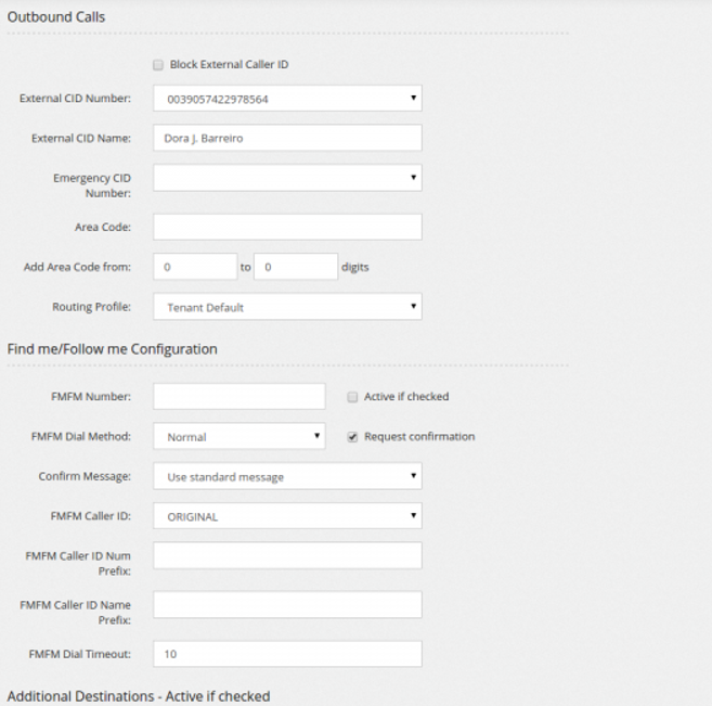 This section allows to configure how the call is managed when dialing out the local virtual pbx. Use of the caller id can be blocked by selecting the “Block External Caller ID” checkbox. This checkbox can be selected/unselected using a feature code. External CID number can be chosen among various formats, usually resembling the E.164 standard. The various options can be enabled or disabled using the Admin/Settings menu. Under normal confition, the External CID number can be chosen only among the DIDs assigned to the tenant. However if the user has the privilege “Can Edit CID Numbers”, a small “Edit” box will appear beside the number, allowing the user to customize the External Caller ID number.