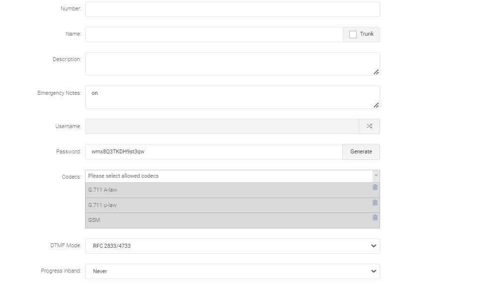 Username is automatically generated adding the tenant code to the number provided. The format used by default is using the “-”, but some phones do not accept the minus sign. The joining character can be changed by pressing on the double arrows. Take in mind the usage of “_” is discouraged and needs to be used only when really needed.
